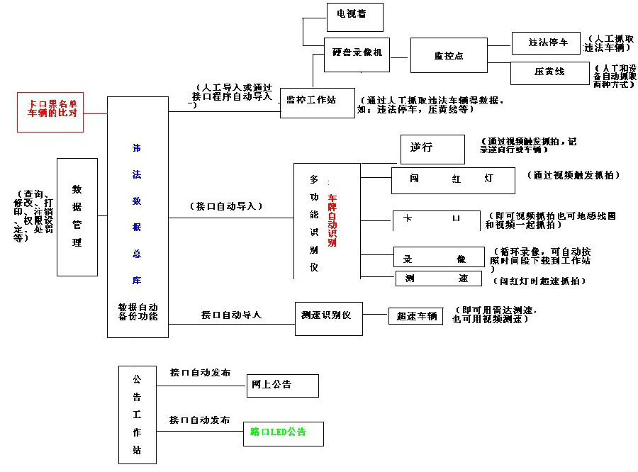 高清智能一體機(jī)的全功能高清電子警察系統(tǒng),摒棄了使用工控機(jī)或DSP嵌入式設(shè)備做控制主機(jī)的傳統(tǒng)前端系統(tǒng)結(jié)構(gòu),并且無需紅綠燈信號(hào)檢測(cè)器。只需一臺(tái)高清智能一體機(jī)就可以同時(shí)實(shí)現(xiàn)對(duì)闖紅燈、不按規(guī)定車道行駛(直行車道左右拐、右拐車道直行、左拐車道直行、違法占用非機(jī)動(dòng)車道等)、逆向行駛、壓黃線等違法行為的監(jiān)測(cè),以及治安卡口、交通流量統(tǒng)計(jì)、高清錄像等多種功能。
